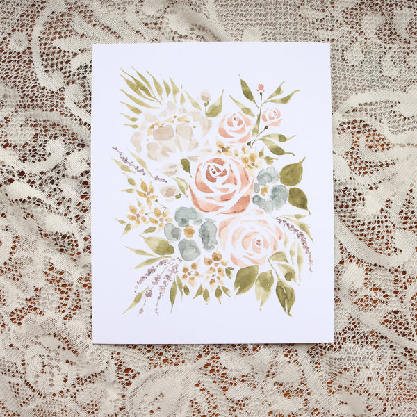 This print features the Aurore painting and its spring mix of spray roses, lavender sprigs, and sea blue anemones. It's available in three sizes and printed on beautiful Fine Art paper.