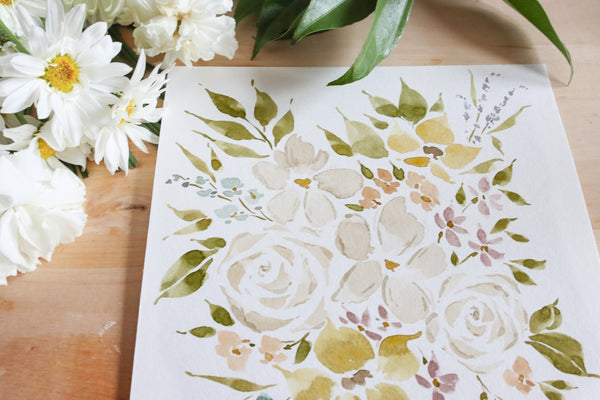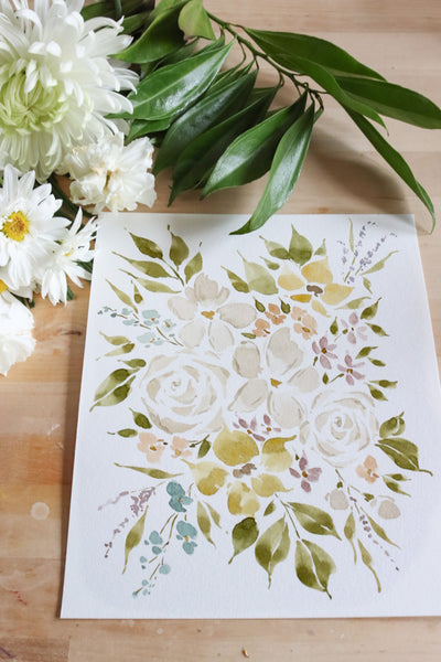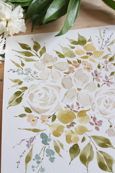 This is an original 8x10 painting featuring cream toned orchids and roses, lavender sprigs, and sunflowers. This is a one-of-a-kind hand painted work.