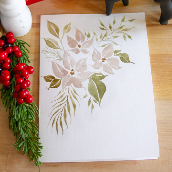 This is one of the holiday stationery designs, and comes with a blank middle to be filled with holiday greetings to loved ones. This card features the Elizabeth painting and its cream poinsettias and greenery.