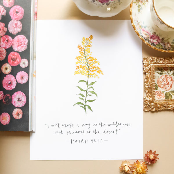 This 8x10 print features a simple, sunshiney goldenrod stem and a promise found in Isaiah. My prayer is that it will be a reminder that our God is hope to the hopeless, love to the broken, and living water in a dry and thirsty land.
