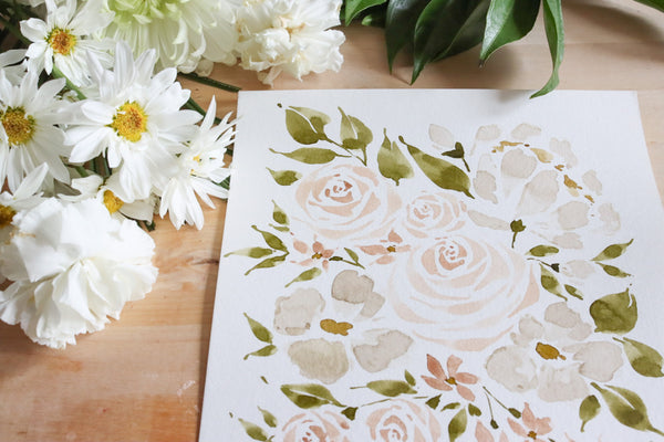 This is an original 8x10 painting featuring blush roses, cream anemones, and olive greenery. This is a one-of-a-kind hand painted work.