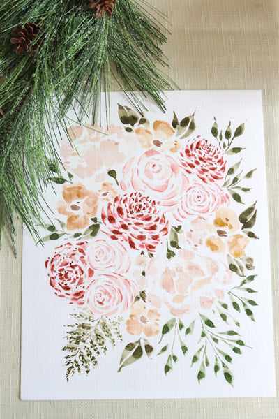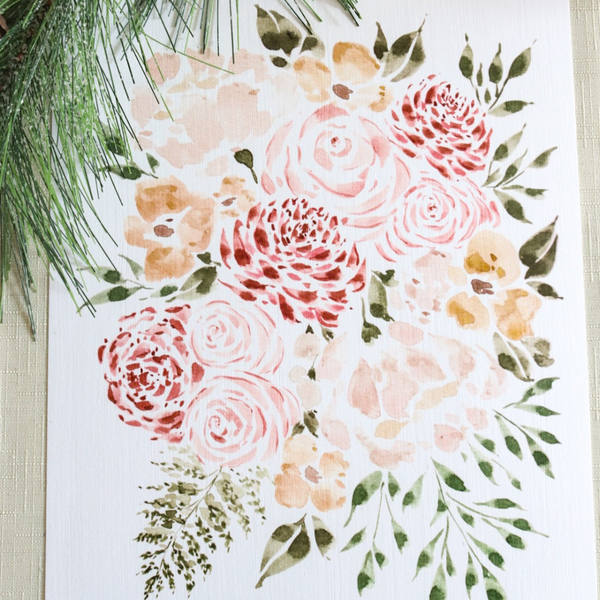 This print features a painting of red mums, blush roses, and cream peonies. It's available in three sizes and printed on beautiful linen Fine Art paper.