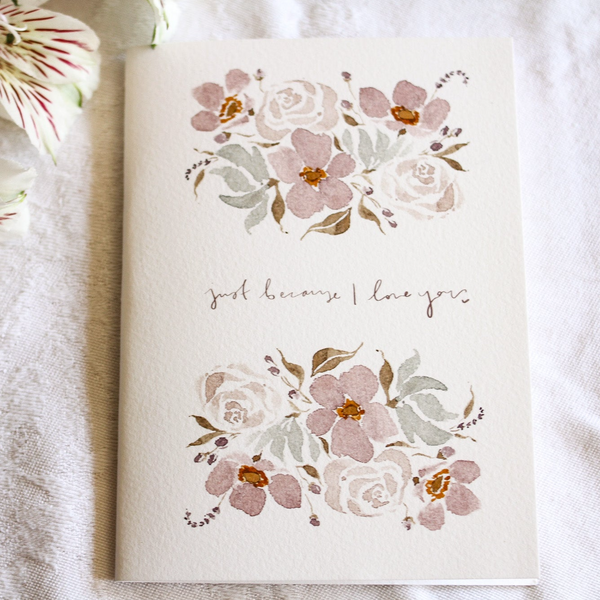 This empty-bellied card comes with an envelope and is printed in house on linen Fine Art paper. This card says, "Just because I love you," and features sprigs of lavender, sea blue blooms, and pale purple autumn anemones.