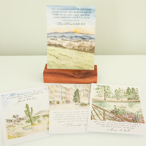 This is a set of four Scripture cards that includes a wooden card holder. Each card features a different Bible verse that has been paired with a piece of my own artwork. Each card has been crafted with love and printed on Fine Art glossy cardstock in house. My prayer is that these would be used to encourage Scripture memory and make beautiful gifts for loved ones! This set includes the four landscape cards, as shown in the pictures.