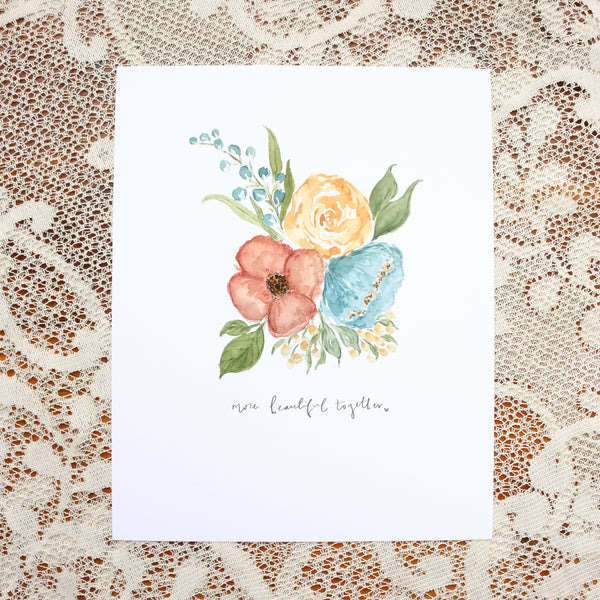 This is what I call the bonus print!! It's an 8x10 print of one of my favorite clusters of blooms. After creating six prints with all individual flowers, I wanted to include a print that tied up the collection. So!! The heart of this print is to remind us that, though we are each beautiful in our own way, that the most beautiful bouquets are made out of combining a mixture of different or diverse flowers... and that we, as humans, are most beautiful when we are unified (and it also is super cute to have if you're married too, hehe).