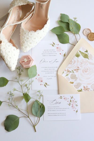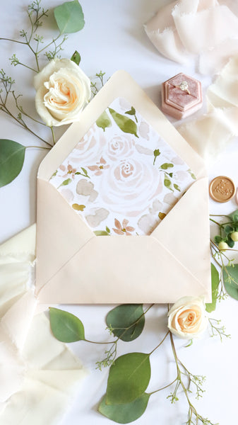 This is a beautiful envelope liner and envelope pairing featuring blush roses and cream anemones and a sparkly light coral envelope. This liner works beautifully with the rosy invitation design pictured.